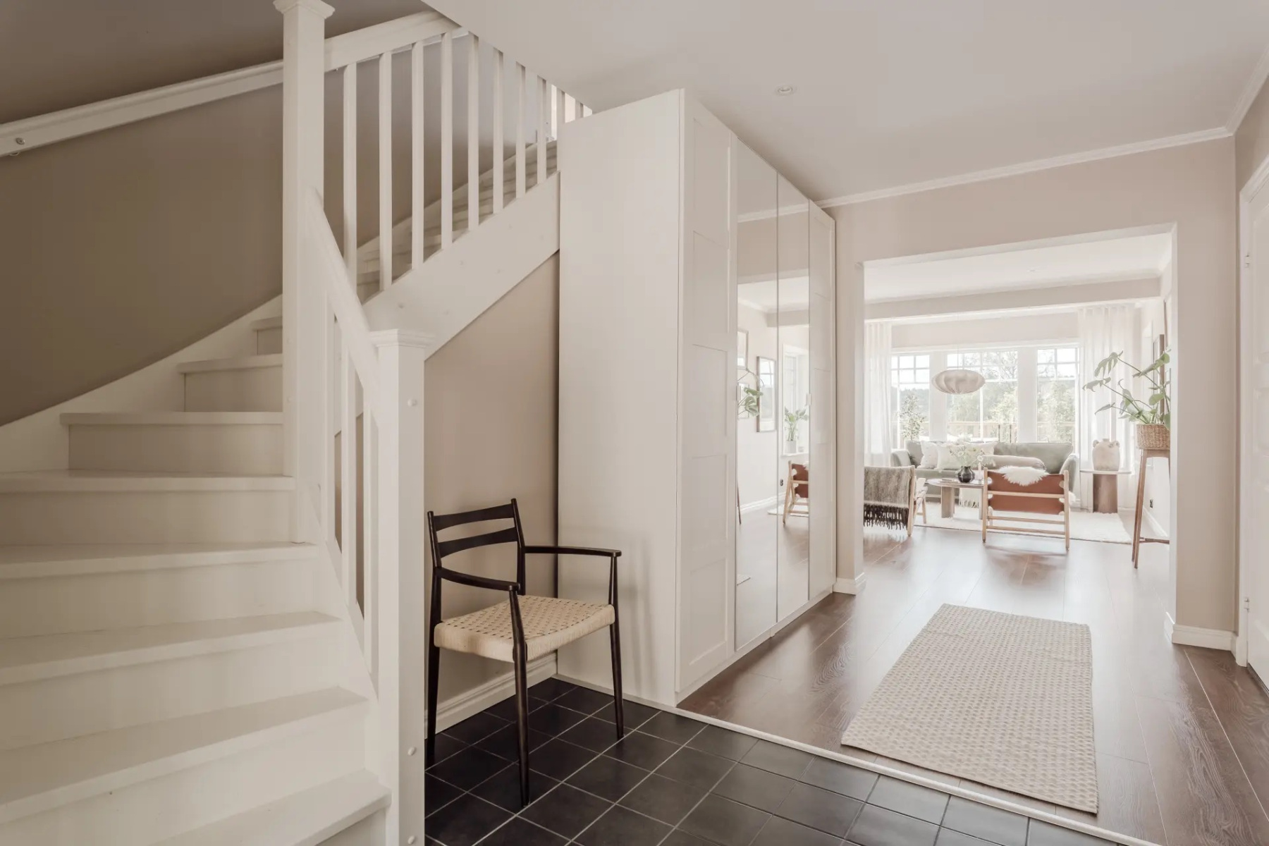Klinkergolv och målade väggar. Här finns plats för avhängning och hallmöbel.