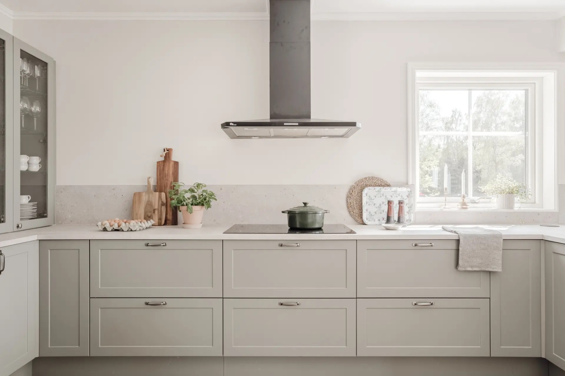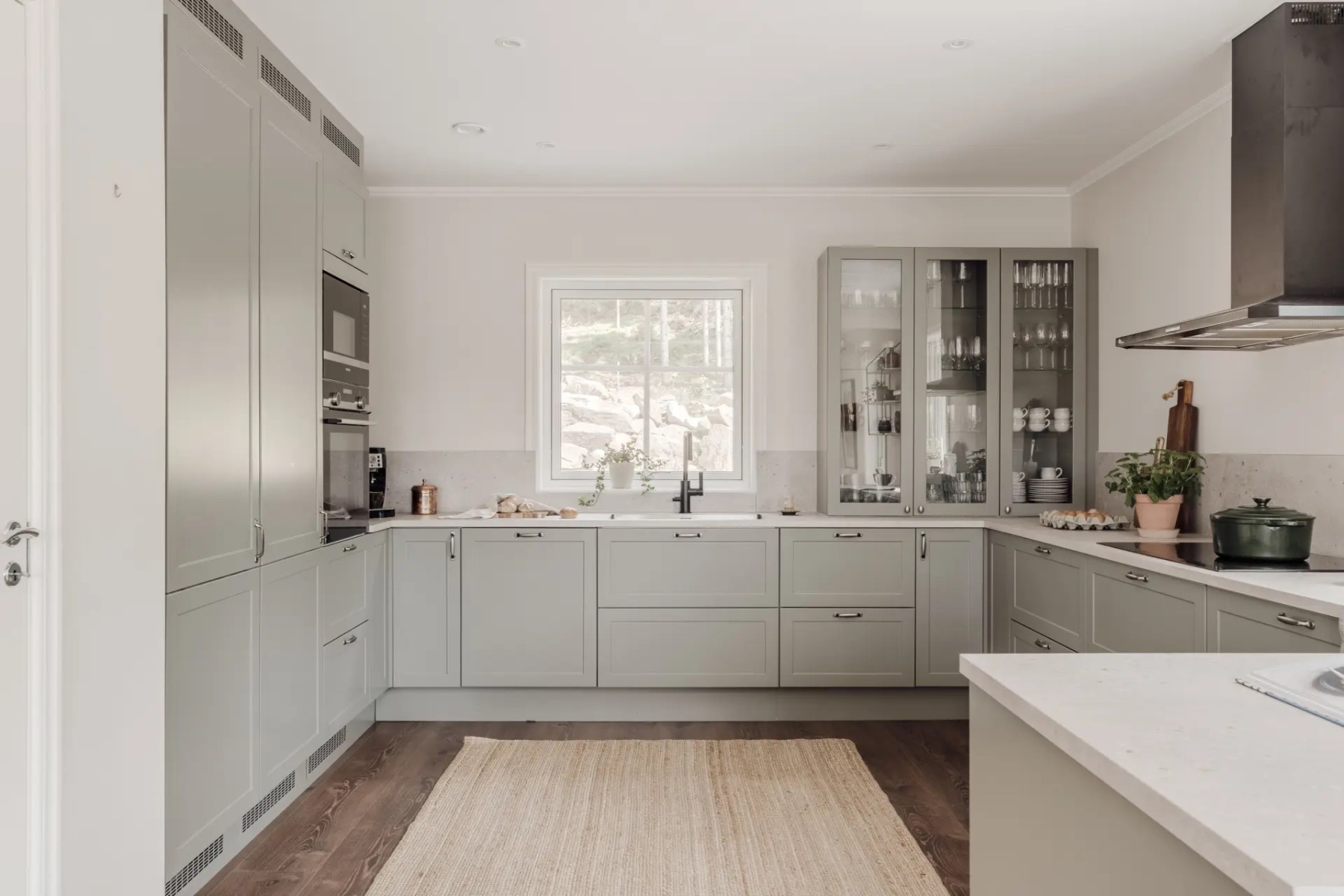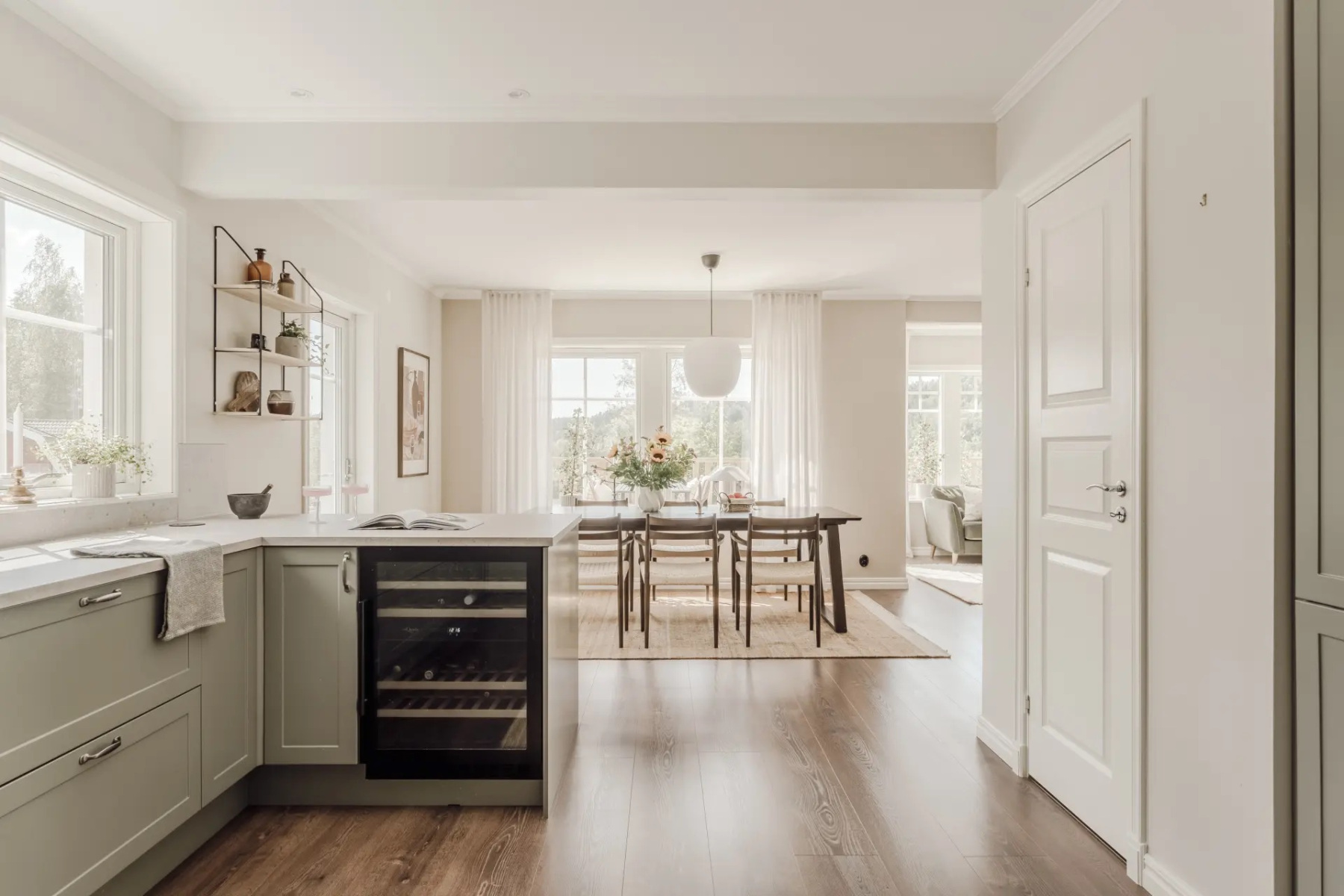 Laminatgolv och målade väggar. Kvalitativ köksinredning från HTH som ger en känsla av exklusivitet samtidigt som de smarta lösningarna erbjuder en otrolig förvaringsmöjlighet. Bänkskivan är i sandstenslaminat och ovan bänkskivan sitter samma laminatskiva som stänkskydd. Den maskinella utrustningen består av kyl och frys i fullhöjd, induktionshäll, ugn, fläkt, inbyggd mikro och diskmaskin. Hela maskinparken är från Siemens utom fläkten som är från Thermex samt vinkylen som är från mQuvée. Förvaring sker i över- och underskåp samt ett större inbyggt skafferi.
