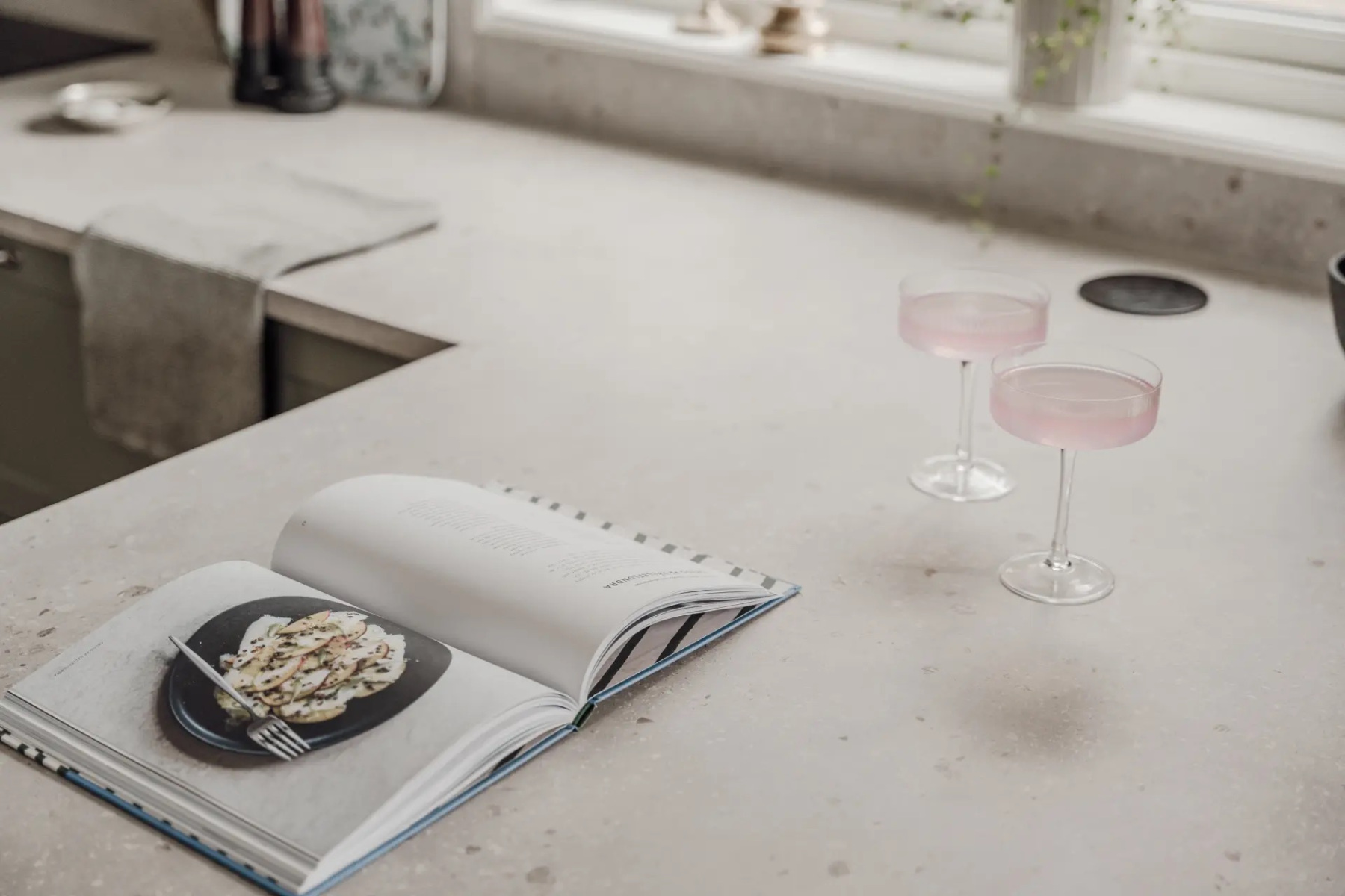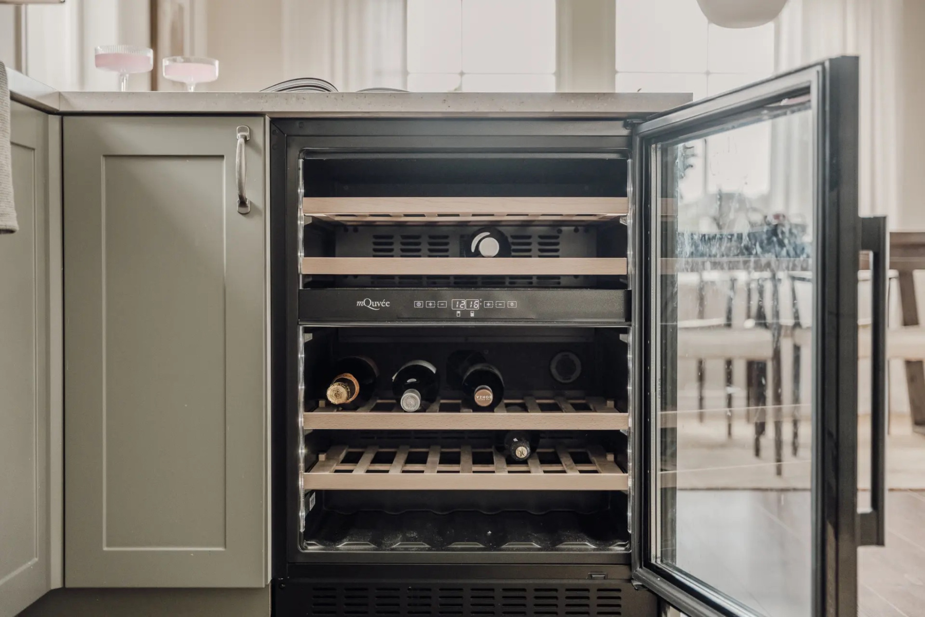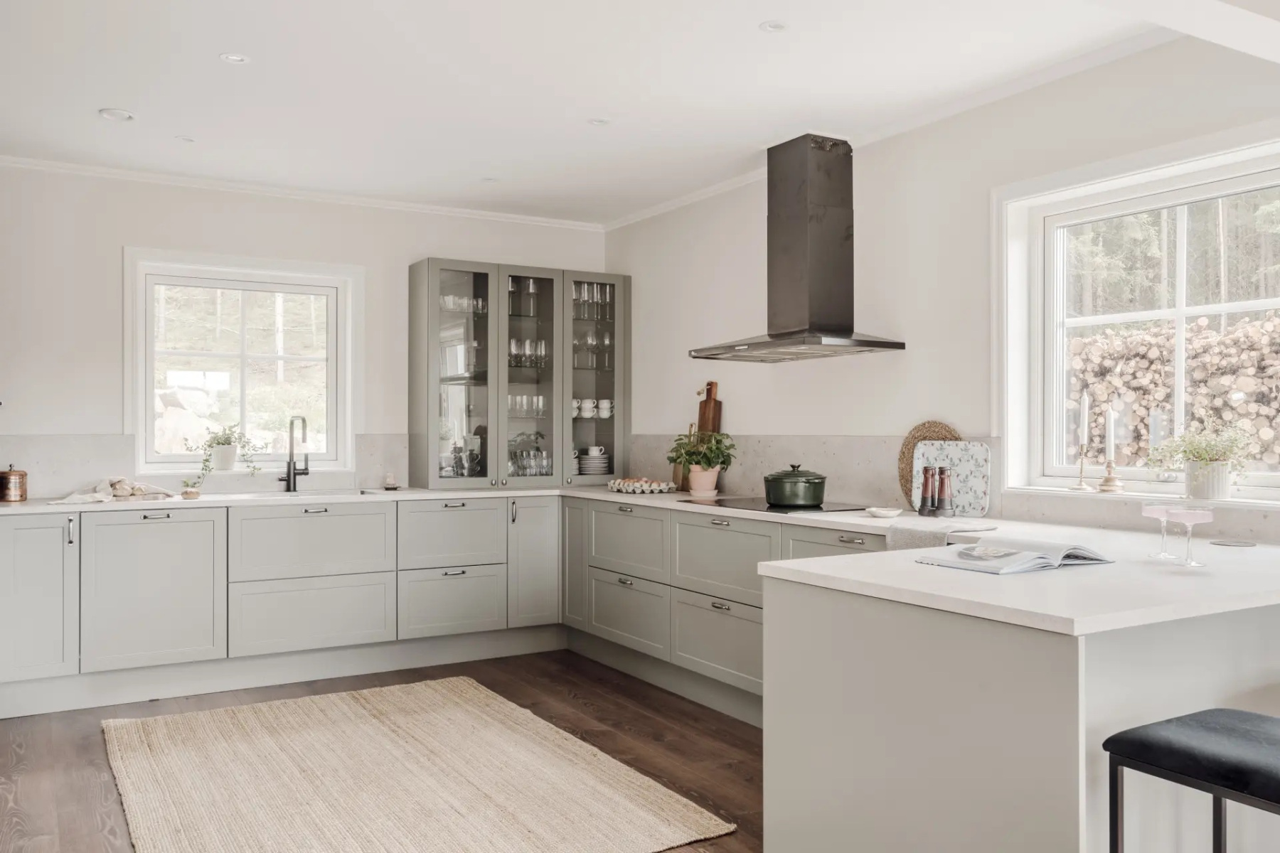 Laminatgolv och målade väggar. Kvalitativ köksinredning från HTH som ger en känsla av exklusivitet samtidigt som de smarta lösningarna erbjuder en otrolig förvaringsmöjlighet. Bänkskivan är i sandstenslaminat och ovan bänkskivan sitter samma laminatskiva som stänkskydd. Den maskinella utrustningen består av kyl och frys i fullhöjd, induktionshäll, ugn, fläkt, inbyggd mikro och diskmaskin. Hela maskinparken är från Siemens utom fläkten som är från Thermex samt vinkylen som är från mQuvée. Förvaring sker i över- och underskåp samt ett större inbyggt skafferi.