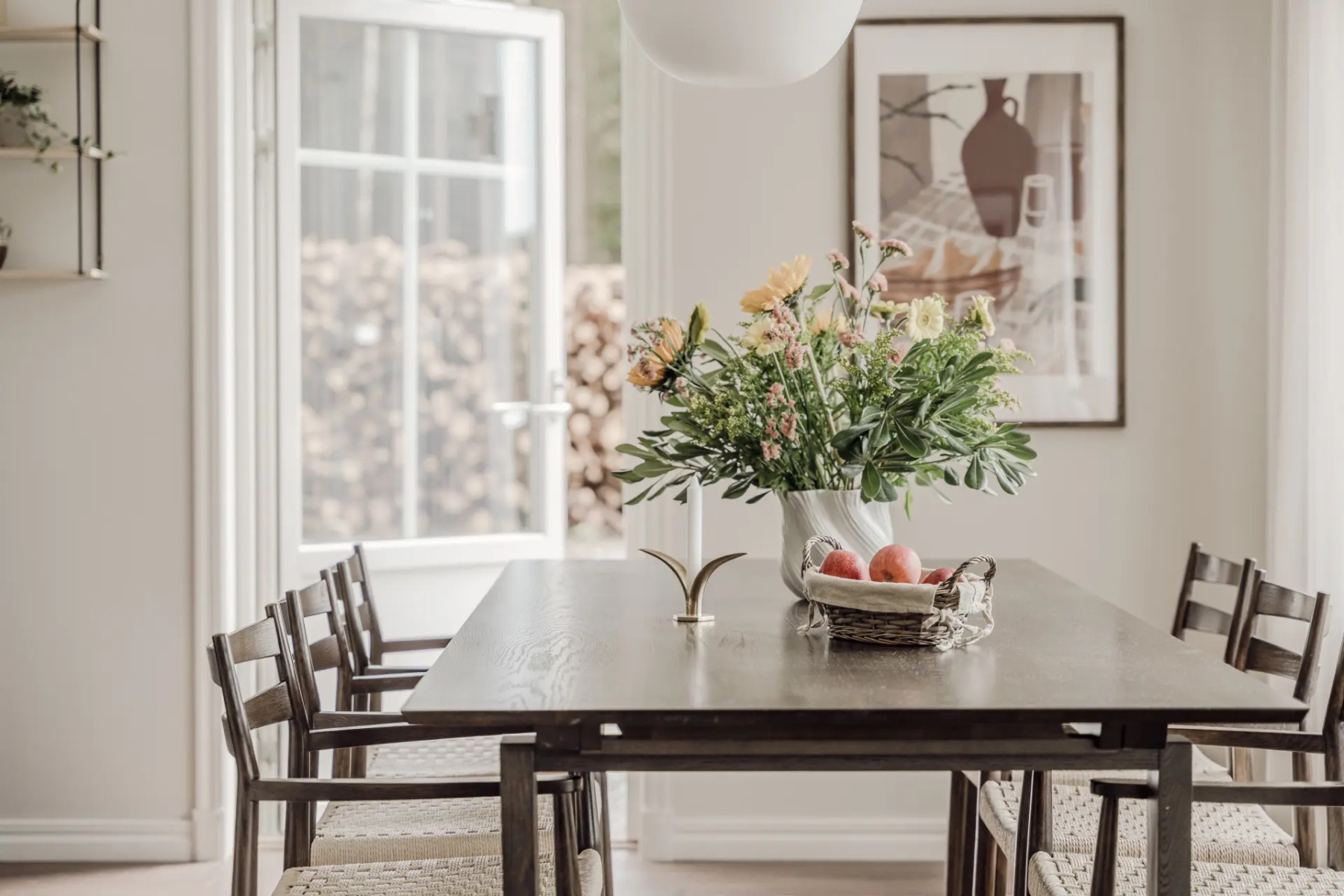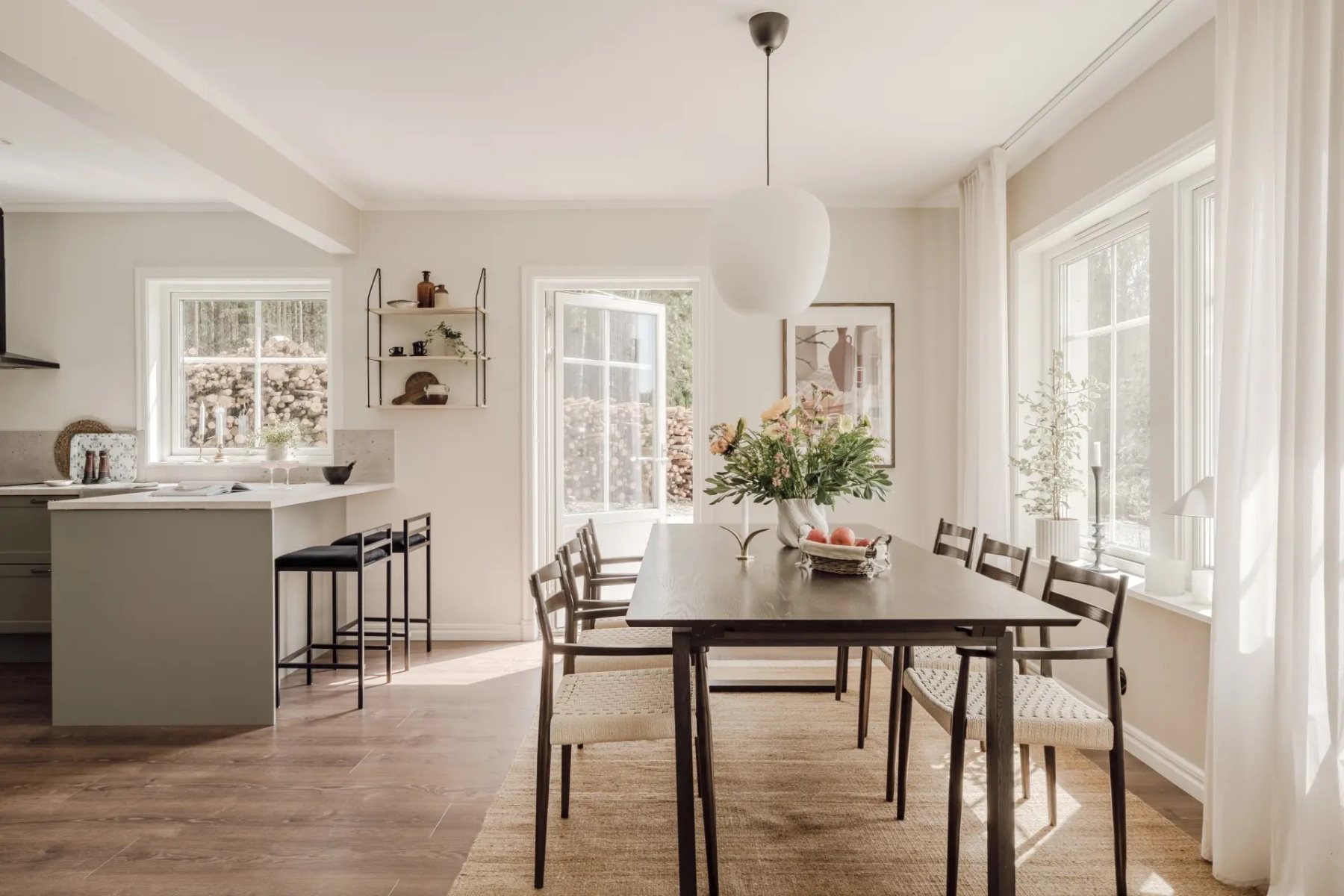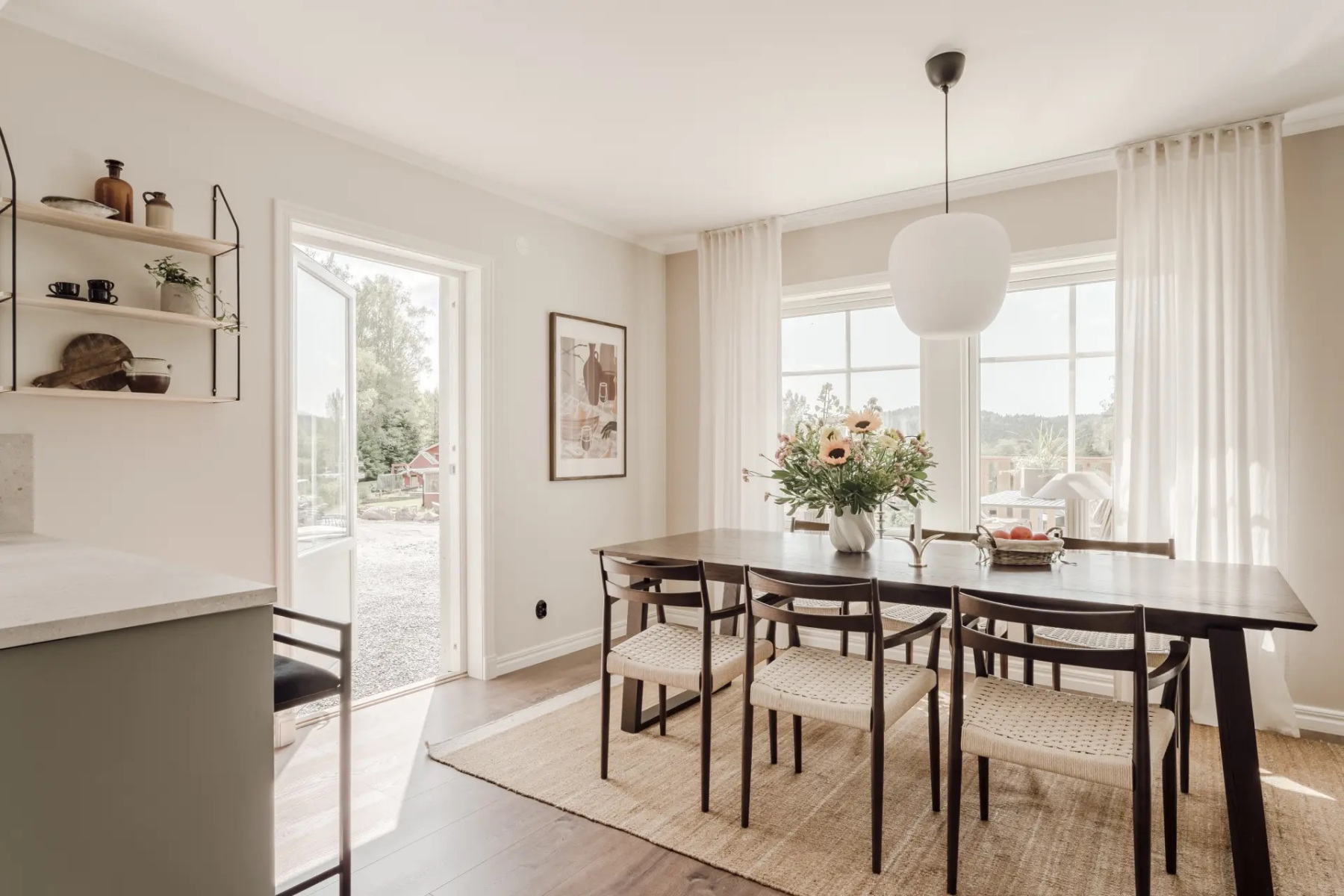Laminatgolv och målade väggar. Här finns plats för soffgrupp med tillhörande möblemang samt matsalsgrupp för ca 6-8 personer. Här finner du även utgången till den härliga uteplatsen i soligt läge.