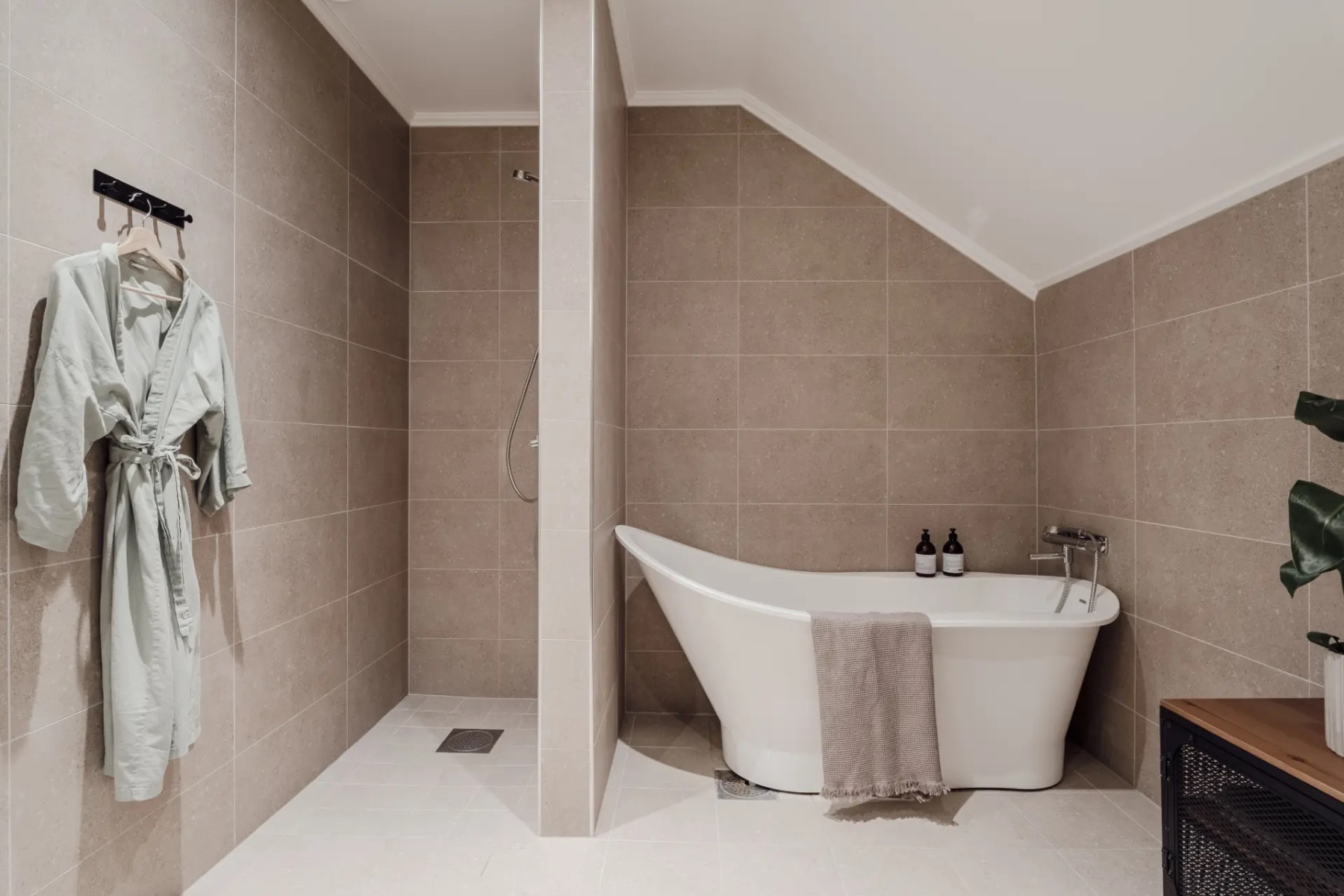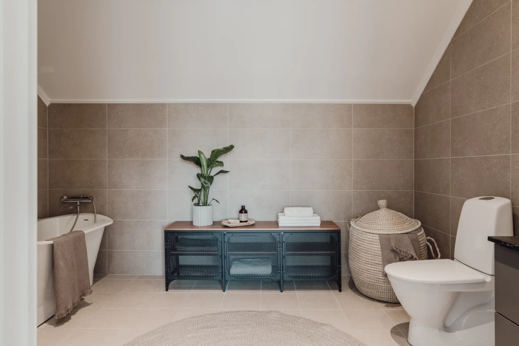 Klinkergolv med underliggande golvvärme och kaklade väggar. Badrummet är utrustat med WC, handfat med kommod, spegel och badkar dusch. I taket sitter spotlights med dimmerfunktion.