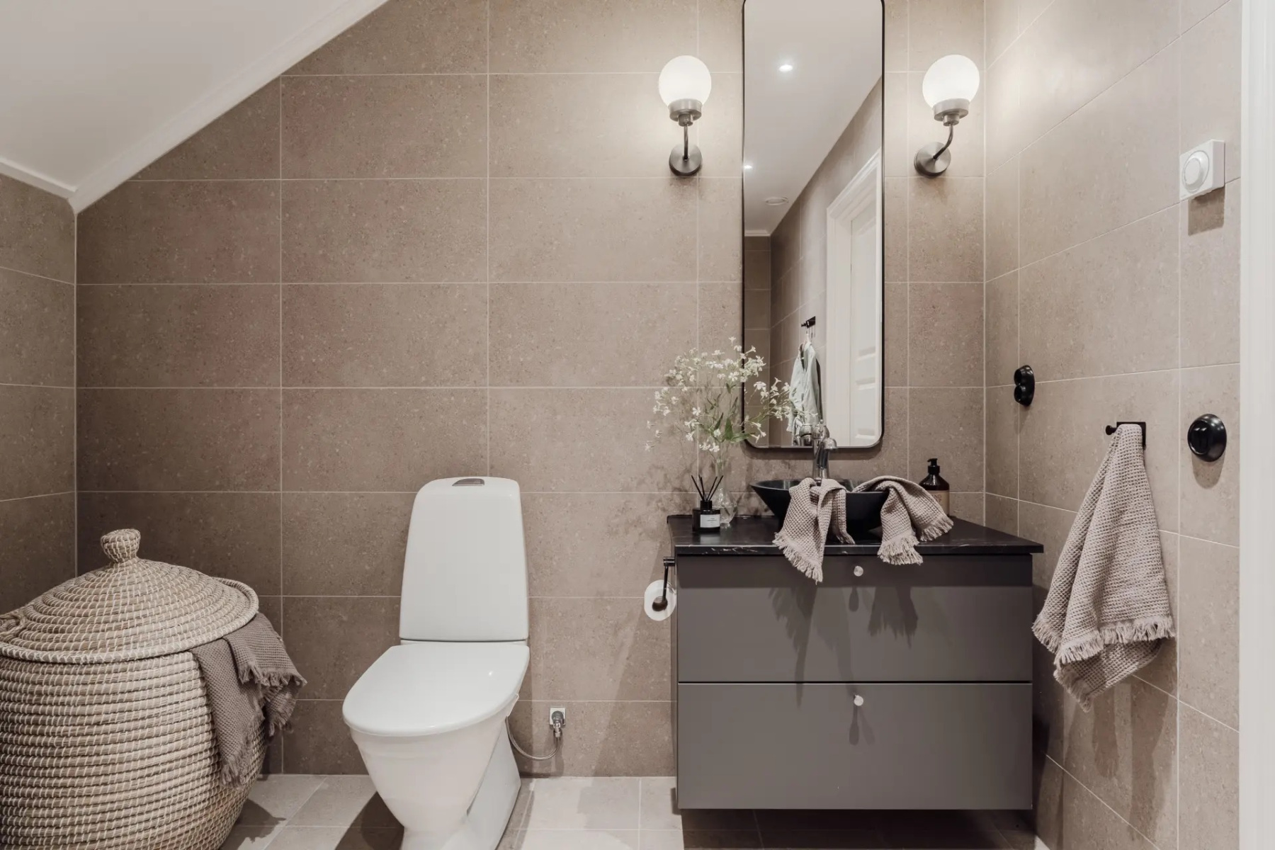 Hemmet präglas av rymliga rum med generös takhöjd som skapar en ljus och luftig atmosfär. Hela entréplanet och vardagsrummet på övre plan är utrustade med små spotlights i fönstren som skapar ett elegant och stämningsfullt ljus. I hallen, köket och vardagsrummet på nedervåningen finns dimbara spotlights som ger dig möjlighet att anpassa ljusstyrkan efter tid på dygnet eller tillfälle. Belysningen är dessutom Plejdstyrd, vilket gör det enkelt att kontrollera och justera den via mobilen eller röststyrning.