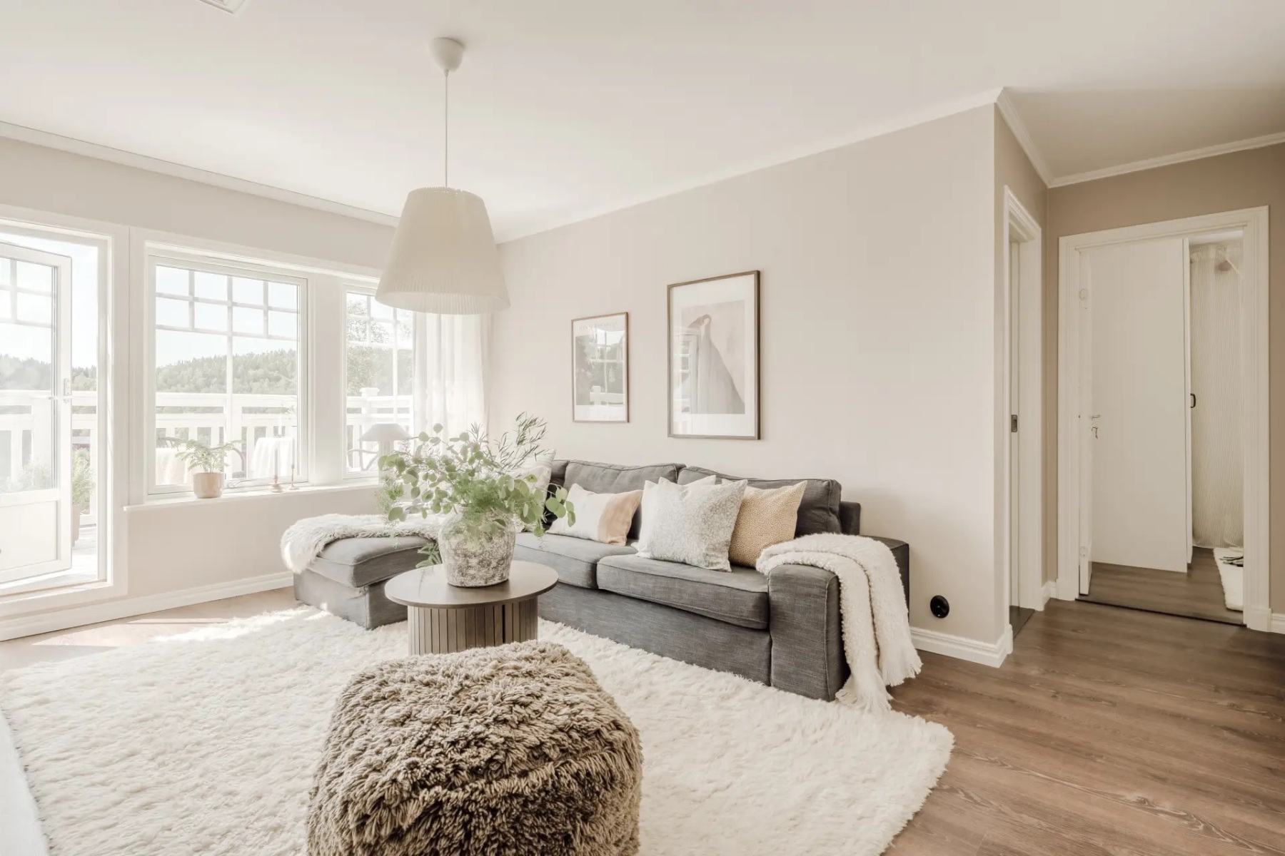 Laminatgolv och målade väggar. Här finns plats för soffgrupp med tillhörande möblemang