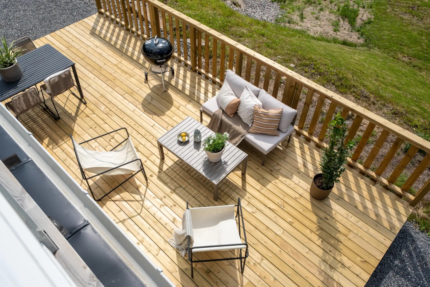 Den stora tomten erbjuder flera uteplatser i olika väderstreck – perfekt för frukost i morgonsolen eller avslappnade kvällar på altanen i västerläge, som nås direkt från vardagsrummet och har sol större delen av dagen. Här finns även goda möjligheter att skapa din egen trädgårdsoas, med plats för både odling, lek och avkoppling.