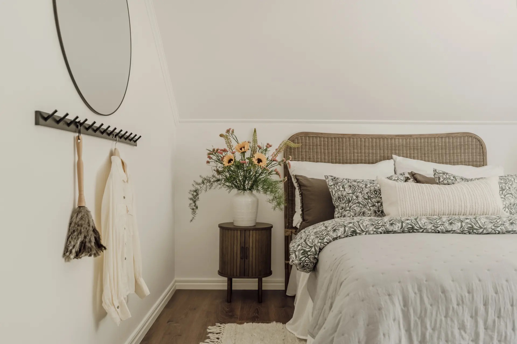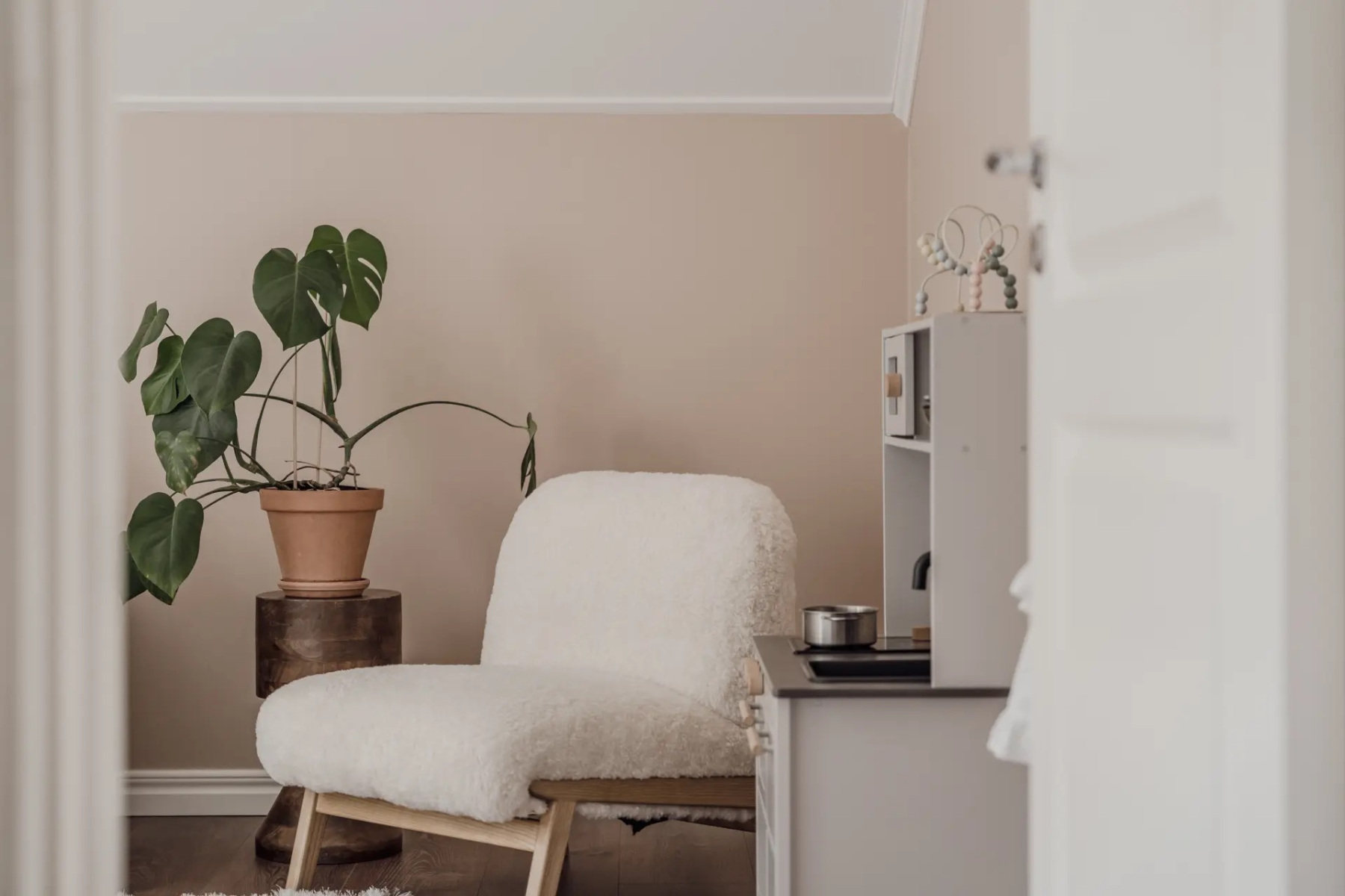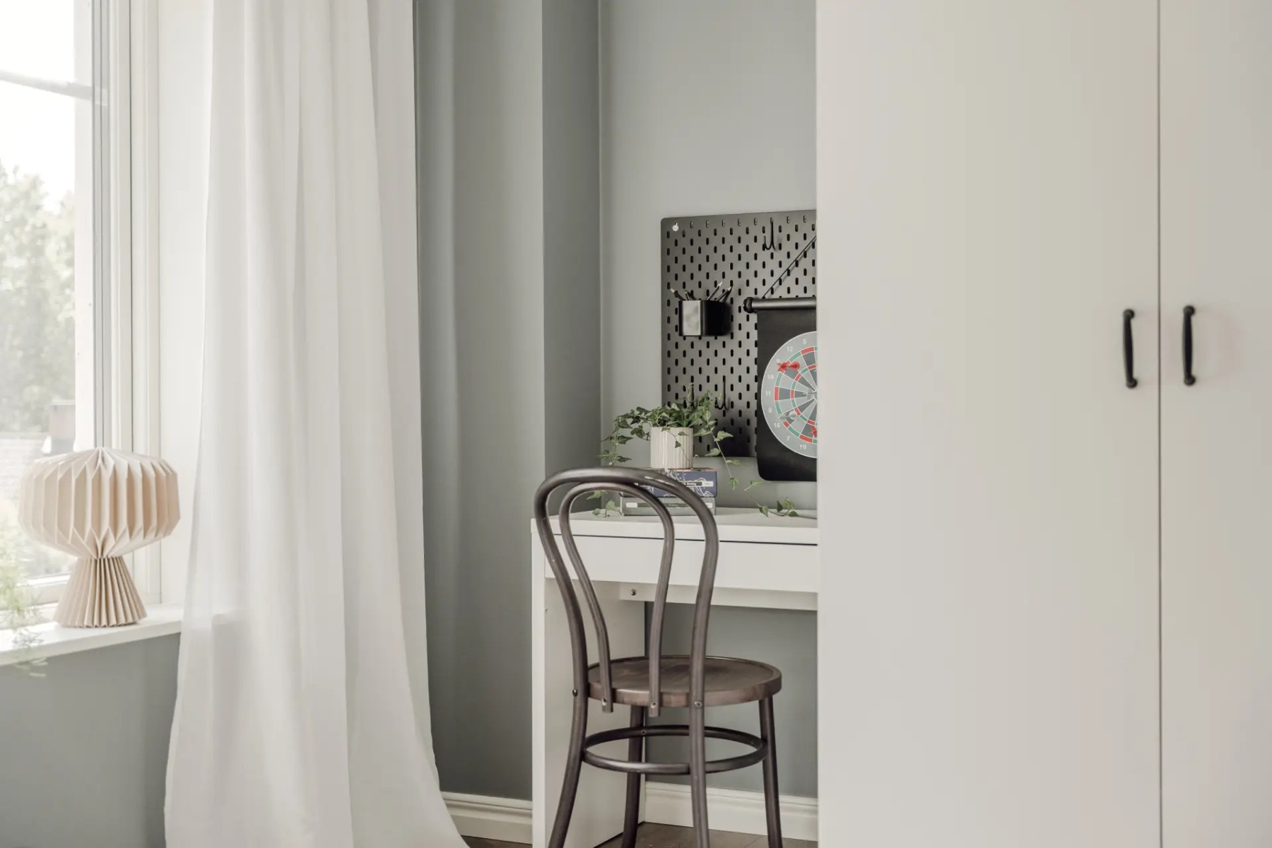 Laminatgolv och målade väggar. Förvaring sker i en garderob men möjlighet till fler.