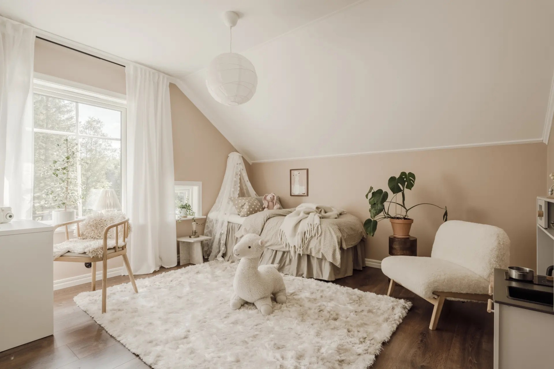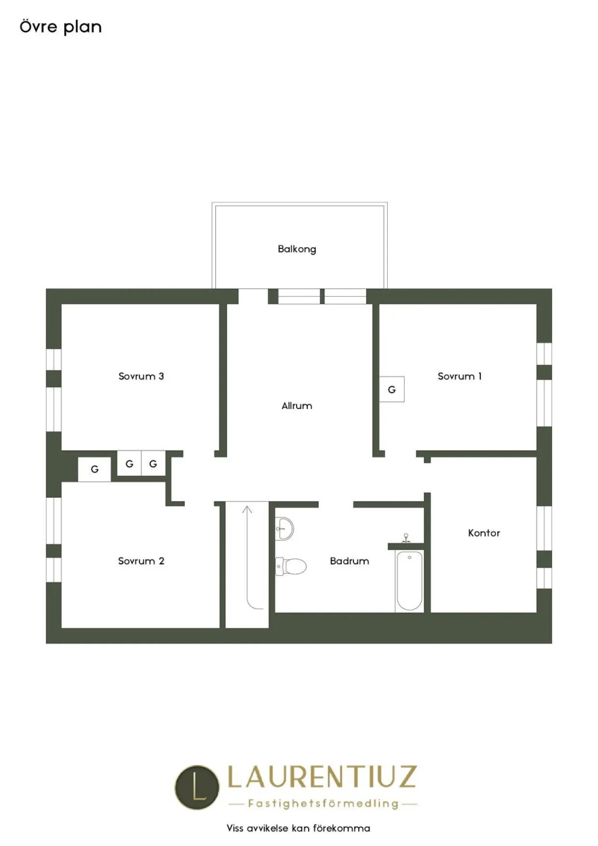 Laminatgolv och målade väggar. Här finns plats för soffgrupp med tillhörande möblemang