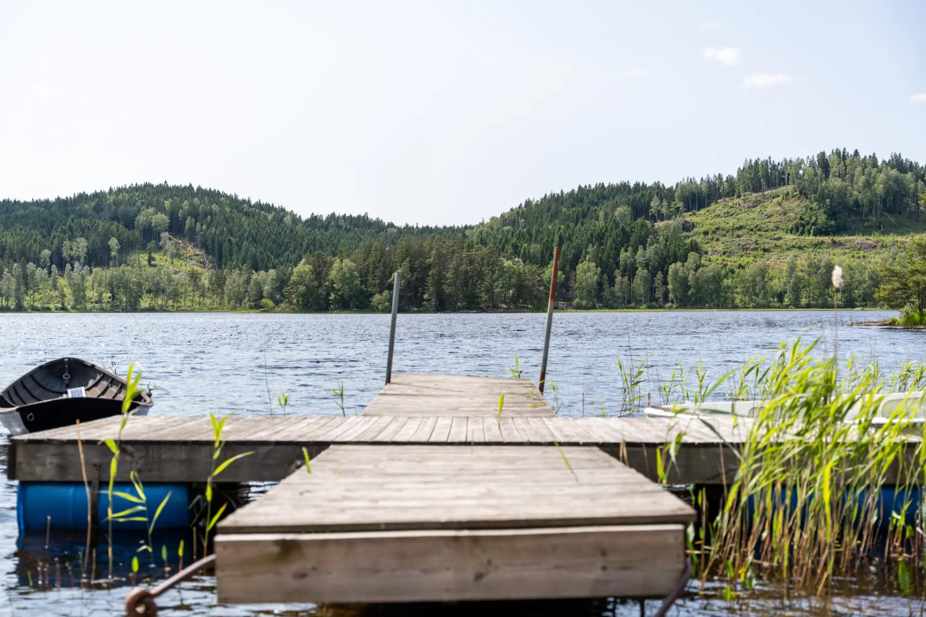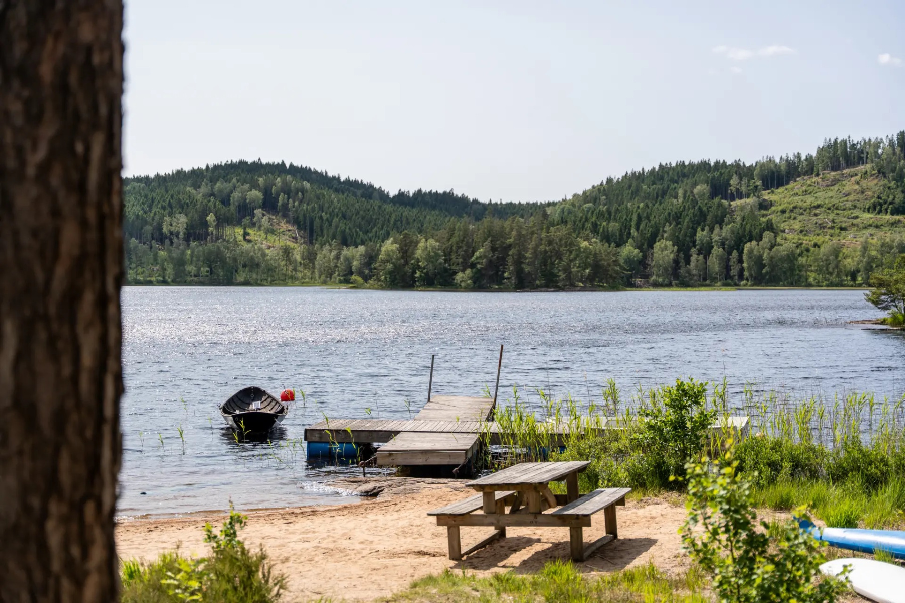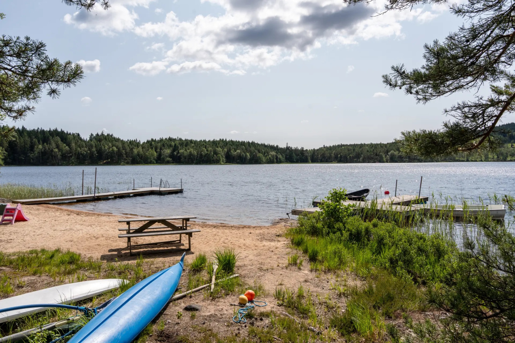 Ett stenkast från huset ligger en liten badplats vid Öresjön med bryggor – perfekt för morgondopp eller lek vid strandkanten med barnen. I anslutning finns även en gemytlig grillplats som bjuder in till fikastunder och grillkvällar i gott sällskap.